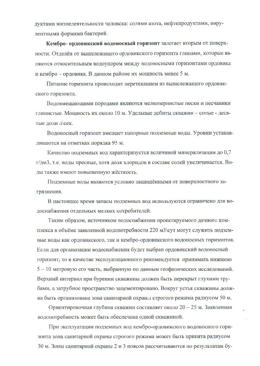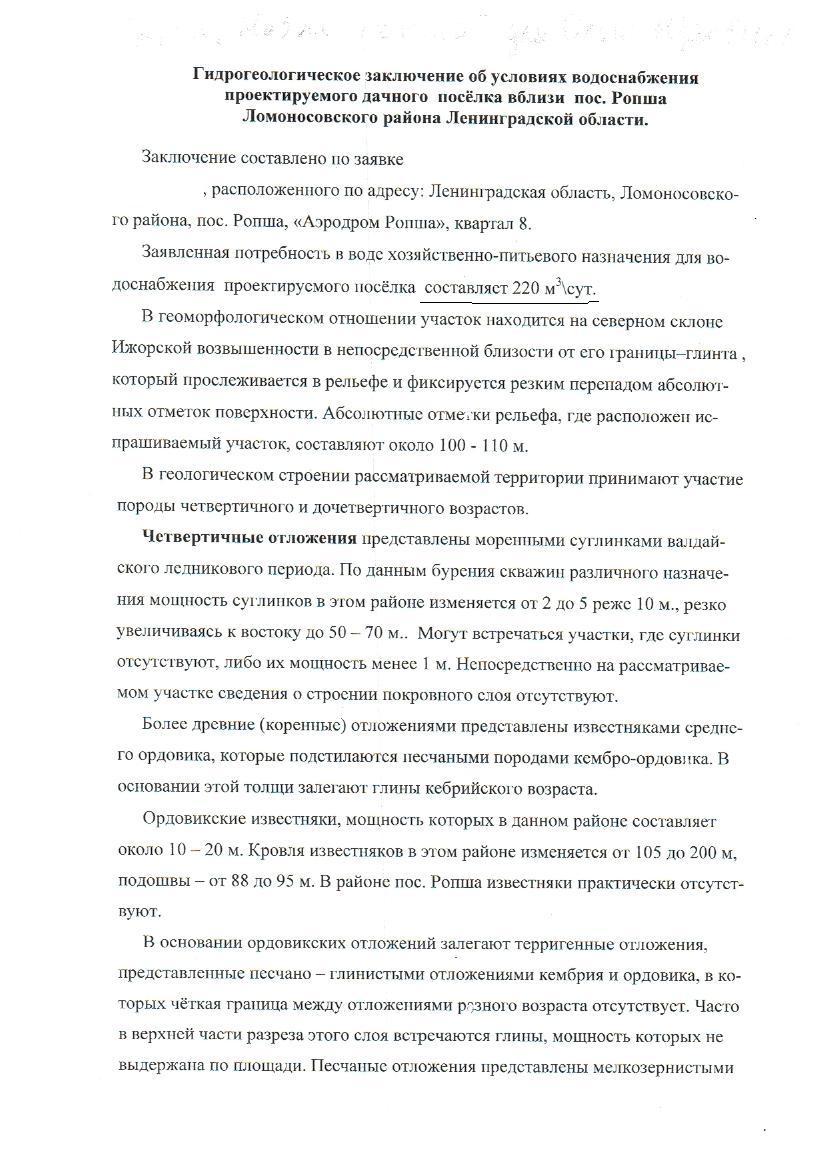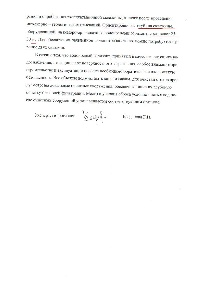 Для оценки стоимости работ по водоснабжению прилагается гидрогеологическое заключение Севзапнедра Роснедр (глубина скважины составляет 25-30  метров), стоимость подрядных работ по бурению скважины соответствует 2500-3000 руб. за погонный метр скважины, выполняемыми специализированными организациями.